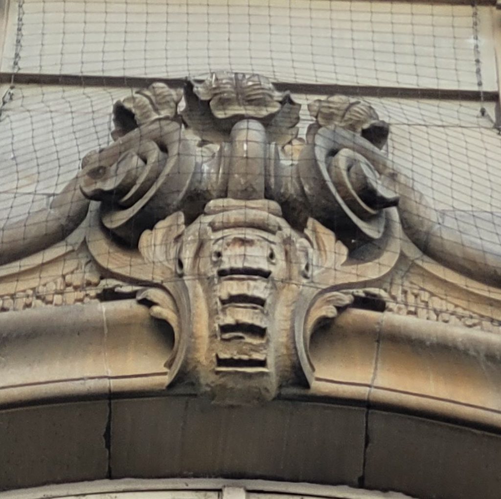 Wie die Bilder unten dokumentieren, sind weibliche (links) und männliche (rechts) Geschlechsteile als dekorative Reliefs schamlos über den Fenstern der Postgalerie-Fassade angebracht.
